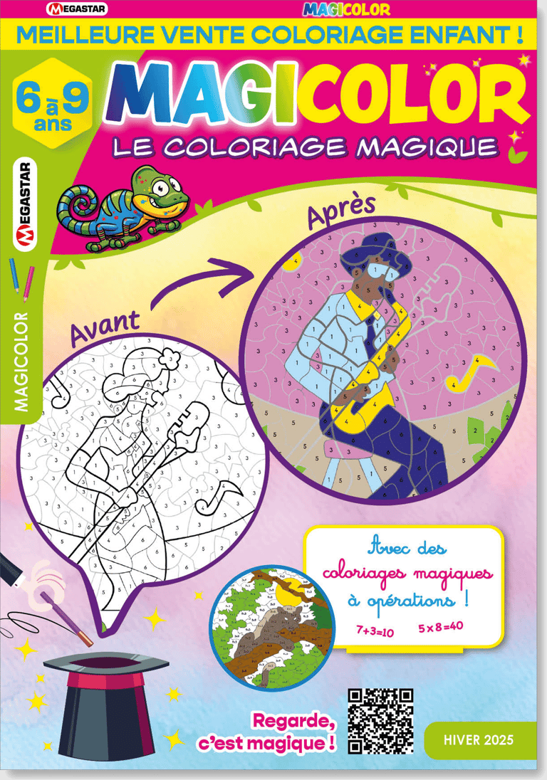 Magicolor est une revue de coloriage spécialement conçue pour émerveiller les enfants de 6 à 9 ans. Elle propose, tout au long de ses 72 pages, un concept unique où le coloriage devient une expérience surprenante. En appliquant les couleurs selon un code, les enfants révèlent peu à peu une image mystère cachée dans le dessin. Avant même de commencer, ils peuvent tenter de deviner ce qu’ils découvriront, ajoutant ainsi une touche de suspense et d’anticipation qui rend chaque session de coloriage encore plus amusante. Le contenu du magazine Magicolor va bien au-delà des coloriages classiques avec ses dessins magiques…